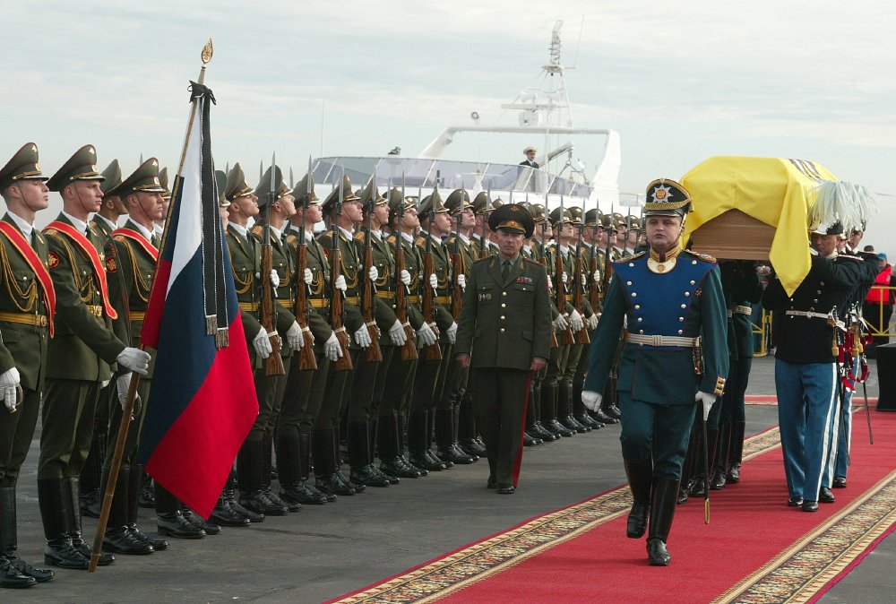 The coffin is landed on the pier of Peterhof Palace, met by a Russian honour guard and by members of the Romanov family and close relatives.